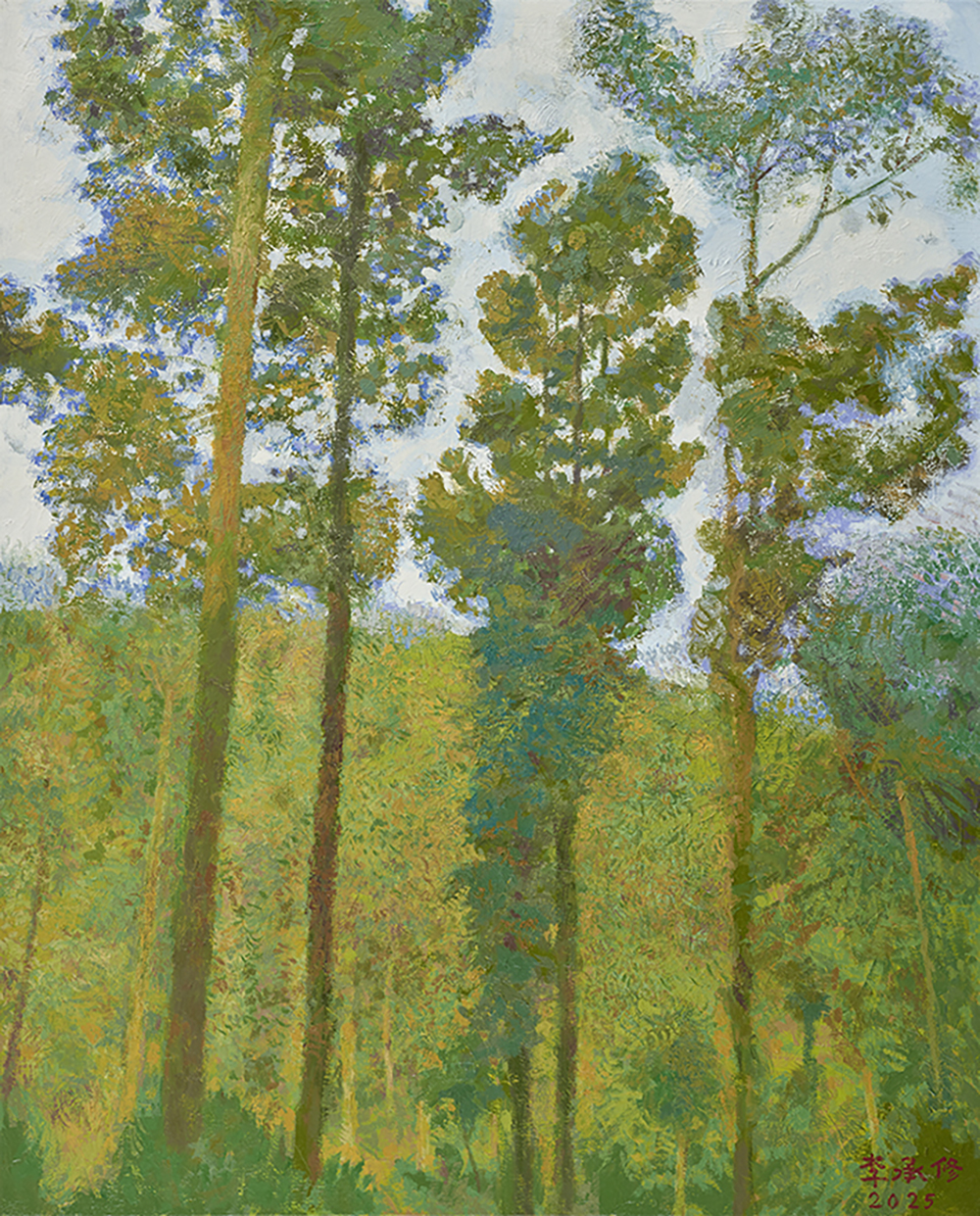 在那些大多是平光的平凡時刻裡,終於時不時有一點陽光從較薄的雲層裡透出來,就在那穿過柳杉並連同後方的整片樹林暖起來的瞬間。
