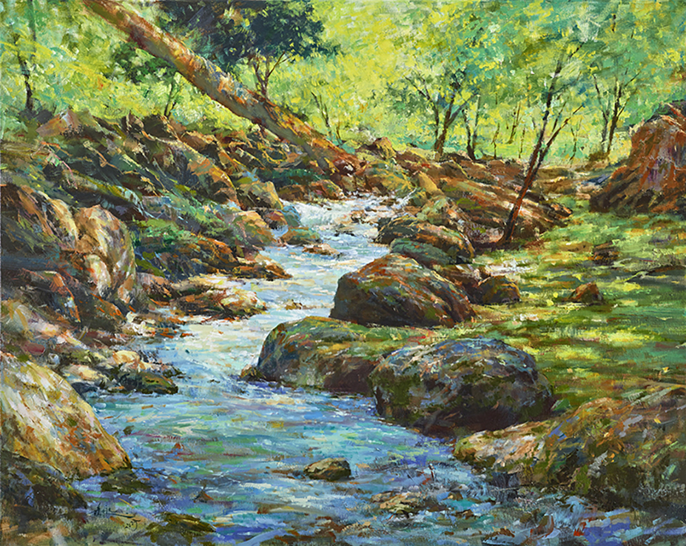 晨光映照,溪水清澈而新生,如同甦醒的第一口呼吸,帶來純粹的希望。