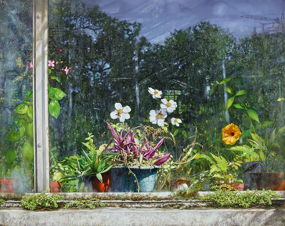 在溫室的溫暖與玻璃的映照下,植物與雜草猶如生命的戰士,為了那一方生存的空間,展現出不屈的韌性與堅持,它們在有限的天地中,無論是欲突破限制的嫩芽,還是倔強生長的雜草,都在用生命的力量抗衡著環境的壓迫。遠處的玻璃反射出都市的繁忙,那鋼筋水泥之間,生命仿佛被擠壓、被挑戰,卻依然在不同的空間中奮力求存。