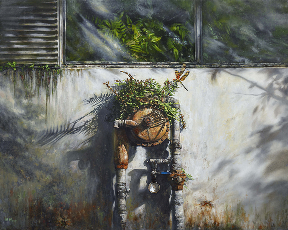 在野草悄然佔據的廢棄機械之間,荒蕪的機械殘骸與溫室中被細心呵護的花草形成強烈對照,一邊是野性不羈的生命自我復甦,一邊是人為溫柔灌溉下的秩序與繁茂,彷彿兩個平行世界中截然不同的生命篇章。