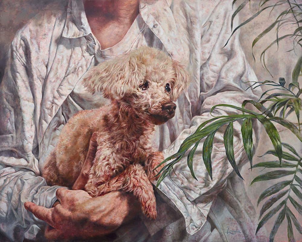 作品以一隻年老且一眼失明的狗呈現生命的脆弱與堅韌。人類的擁抱與植物的穿插,構成多層次共融:不同生命在時間中相互扶持、依存。老狗雖有缺損,仍展現尊嚴與價值;植物象徵生命延續與交織。畫面不僅表達哀愁,更傳達理解、包容與陪伴的哲學:生命意義在於彼此陪伴中找到共存與安然。