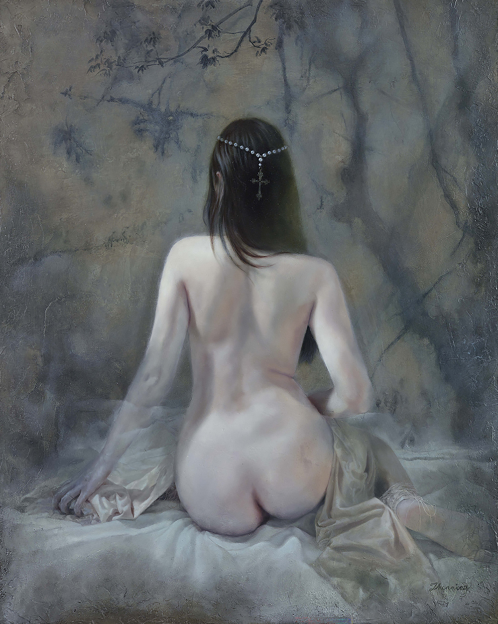 她背對觀者,曲線在光影下顯露,十字架隱匿其中。蕾絲的包裹將她置於「優雅」與信仰的框架中,身體如祭壇般被凝視卻無法言語。女性在文化與宗教審視下,美麗與束縛並存,沉默成為反抗,也是一種無聲控訴。
